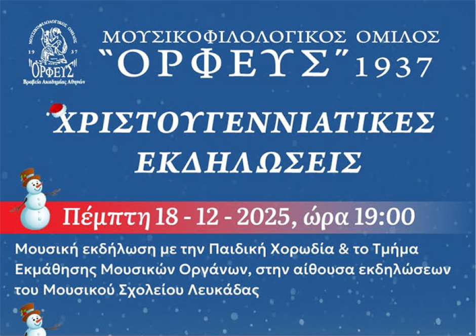 Την Πέμπτη 18 Δεκεμβρίου 2025, στις 19:00, στην αίθουσα εκδηλώσεων του Μουσικού Σχολείου Λευκάδας, θα πραγματοποιηθεί η Χριστουγεννιάτικη Μουσική Εκδήλωση του «Ορφέα», με τη συμμετοχή της Παιδικής Χορωδίας και του Τμήματος Εκμάθησης Μουσικών Οργάνων.