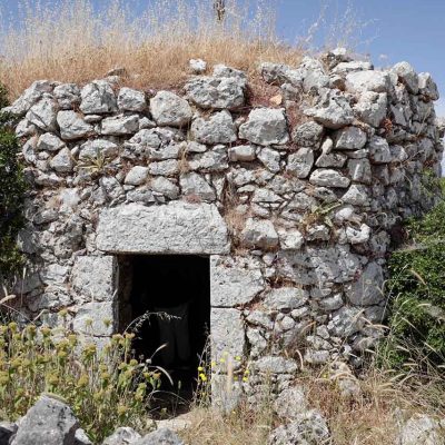Στην επιστροφή μας, μια στάση στον Άγιο Δονάτο ήταν απαραίτητη για να βγάλουμε κρύο νερό από το μαγκανοπήγαδο, να δροσιστούμε. Εκεί ήρθε η συζήτηση για τα περίφημα «βόλτα», τα περίεργα θολωτά πετρόκτιστα καλύβια που είναι διάσπαρτα σε όλη την περιοχή. Ενώ απέξω φαίνονται πολύ μικρά, όταν μπεις μέσα έχεις άλλη αίσθηση του χώρου. Έτσι όπως το είδα εξωτερικά, νόμιζα ότι με βία θα χωράει ένας άνθρωπος, αλλά όταν μπήκαμε καταλάβαμε το μέγεθος του. Φτιαγμένα και μελετημένα να προσφέρουν καταφύγιο στους παραγωγούς, στην σοδειά τους αλλά και στα ζώα τους, τα παλιά χρόνια. Με σωστό εξαερισμό και φωτισμό από το μικροσκοπικό άνοιγμα της οροφής και την τοξοτή και στενή είσοδο για να προφυλάσσει όσους ξαποσταίνουν.