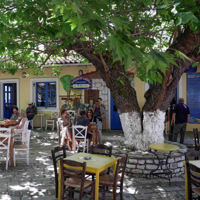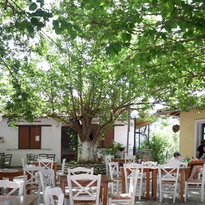 Κατηφορίσαμε προς το χωριό να δροσιστούμε λίγο και να συνεχίσουμε. Η ζέστη είχε αρχίσει να γίνεται αφόρητη κι ο ήλιος να καίει υπερβολικά. Στην πλατεία της Εγκλουβής, κάτω από την παχιά σκιά των πλατάνων, εκεί καθίσαμε να ξαποστάσουμε μετά από τόσες ώρες στο λιοπύρι που λες κι ήταν Αύγουστος κατακαλόκαιρο. Κι ας ήταν μόνο στα μέσα Ιουνίου. Εκεί απολαύσαμε καφεδάκι και Λευκαδίτικη λαδόπιτα στο καφενείο της Αναστασίας Θερμού και του γιού της Ανδρέα.